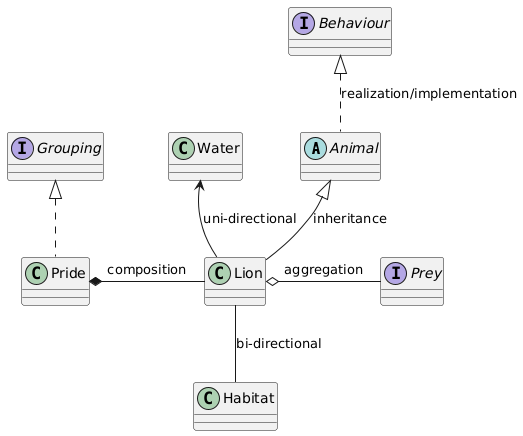 - A bi-directional association is indicated by a solid line between the two classes. In the example, the Lion lives in his Habitat, but the Habitat benefits in some way from the Lion as well.